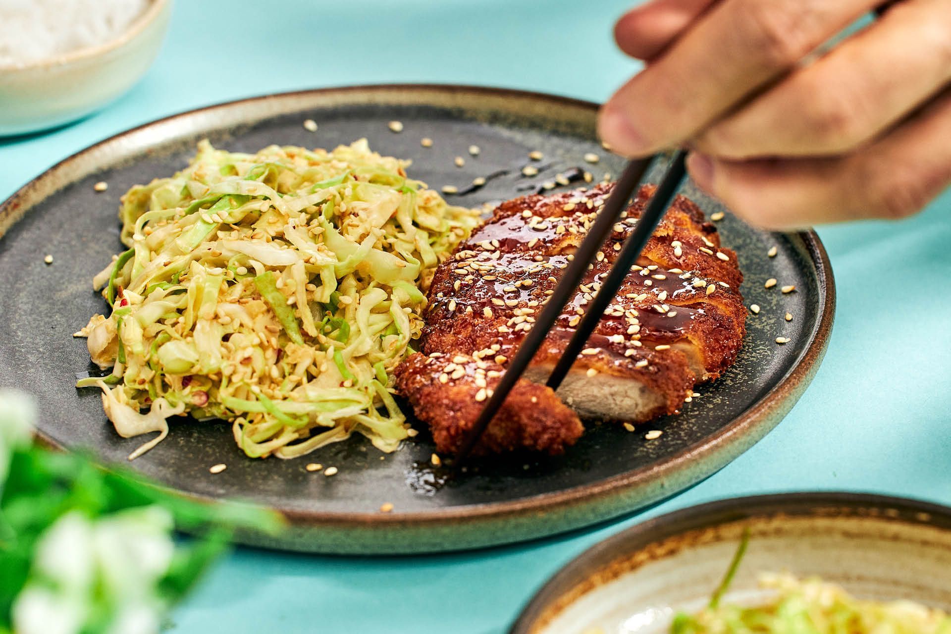 Tonkatsu är Japans svar på en panerad schnitzel. Rätten består av en pankopanerad fläskkotlett som toppas med sås och serveras med en frisk kålsallad och ris. I Japan serveras fläskkotletten i fina skivor eftersom den traditionellt äts med pinnar. Vår egen tonkatsu serverar vi med nykokt ris och en krämig spetskålsslaw. Fläskkotletten toppar vi med en klassisk teriyakisås som ger en fin sötma.