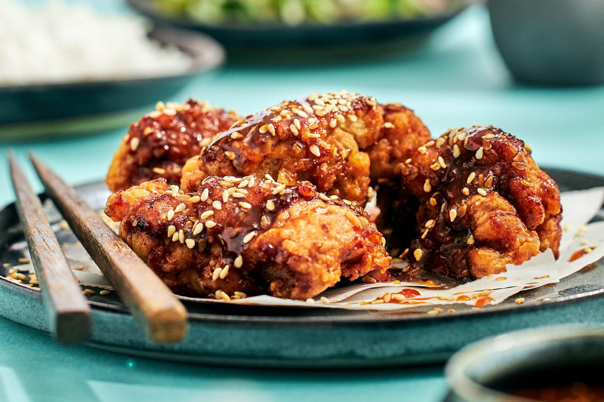 I Linas Matkasse har vi valt att byta ut kycklingvingarna mot lårfilé – en matigare råvara med mört och saftigt kött. Kycklingen toppas med soja- och sesamsås och serveras med nykokt ris och en krispig sallad på gurka och pakchoy. Salladen blir ett friskt tillbehör som balanserar upp både sötman och hettan i rätten.
