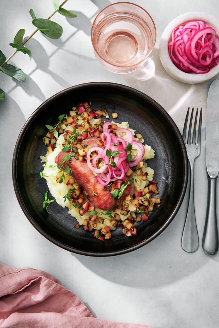 Servera salsiccia med potatisstomp, timjanstekta äpplen och picklad rödlök.